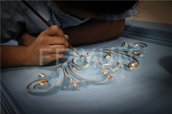 描金工藝(圖1)是另一種形式的做金。在稀料中按固定配比混入金粉,由描金工匠用工藝筆蘸取金水在雕花、線槽等部位手工描畫。首先要注意用金不宜過厚,過厚則呈色灰暗,且易產生“脫衣”(即金色的脫落)現象。其次用金要一筆涂成,不要加填,否則也會影響呈色,引起“脫衣”。
